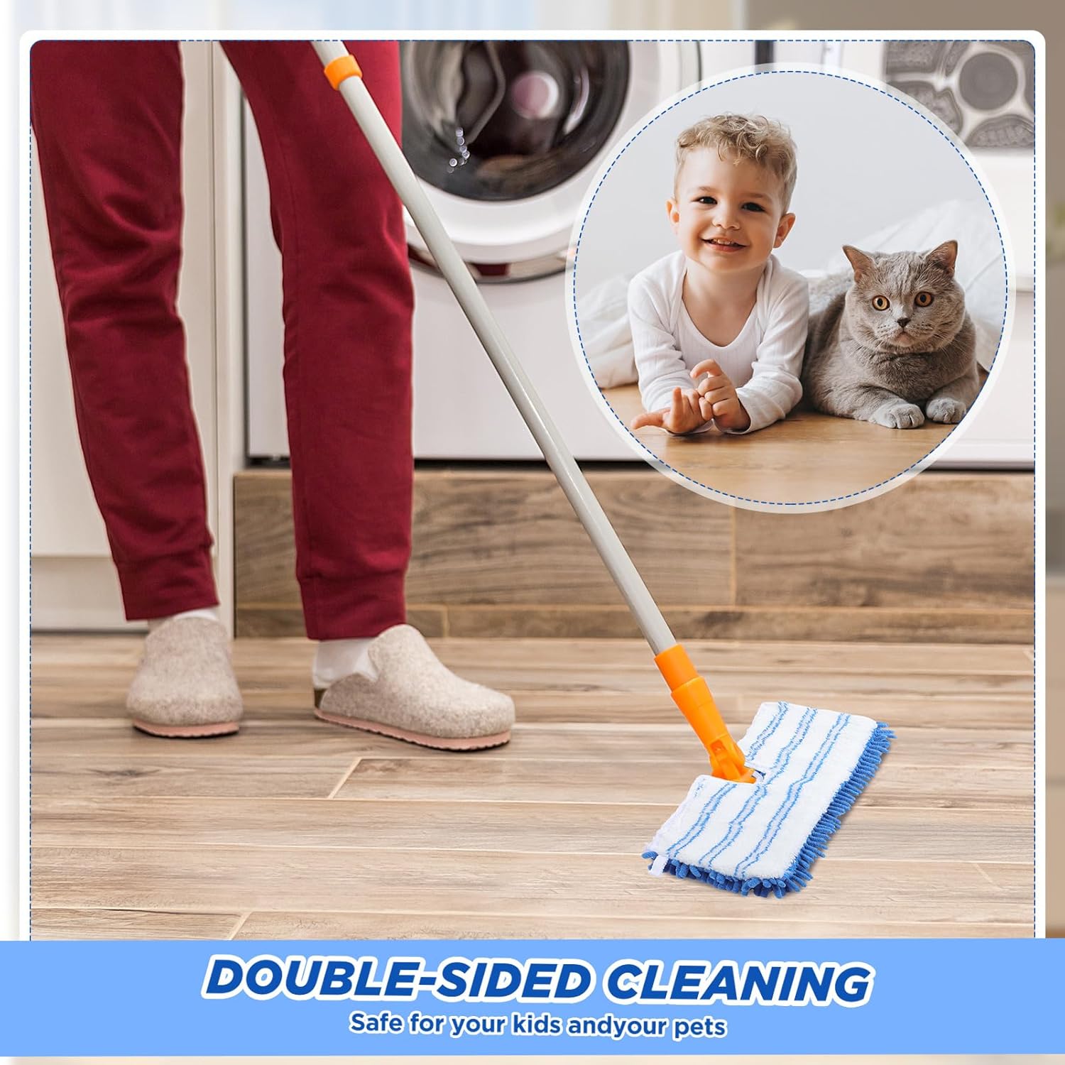 • Multiple uses: the mop pad is a two-in-one system with dry and wet usages, the chenille material on one side is applied for dust removal and cleaning, the microfiber on the other side can be applied for deeper cleaning, which can be applied on any hard floor surface in the home or work space