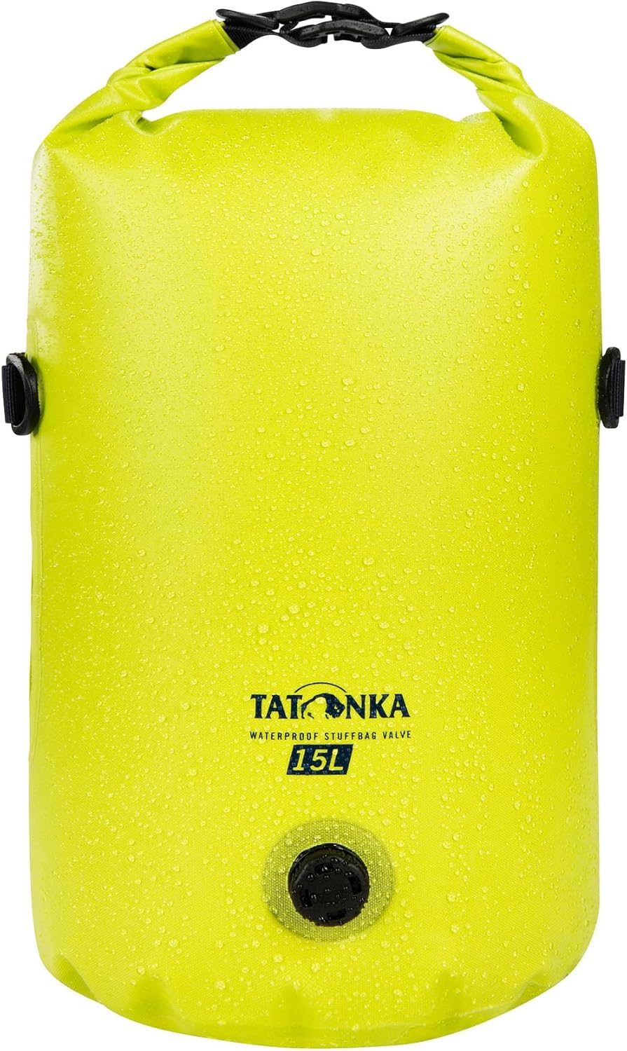 WP Stuffbag Valve 15 L / 25 L / 48 L by Tatonka: lightweight, waterproof pack sack with roll closure and outlet valve. Lightweight, waterproof pack bag from the German outdoor brand Tatonka. With roll closure and 15, 25 or 48 litre volume. To let excess air out of the bag, the WP Dry Bag Valve has a valve. This can be opened and closed again. The storage bag is PVC- and PFC-free and is made of robust polyamide material. Welded laser-cut elements with slots allow the attachment of the roll closure as well as the fixing of the pack bag (for example in the boat or on the bike). The two removable D-rings on the side of the dry bag can be attached to a carrying strap or two shoulder straps if desired (not included). The dry bag with valve is available in the following sizes: - 15 litres. - 25 litres. - 48 litres. The features at a glance: • Waterproof roll closure with hook closure and D-rings. • Very lightweight, waterproof material. • High-frequency welded seams. • Welded laser cut elements with slots. • Free from harmful substances (PFAS/PFC-free). More details: • Capacity / dimensions / weight: - 15 litres, diameter 20 x 40 cm, 184 g. - 25 litres, diameter 22.5 x 48 cm, 220 g. - 48 litres, diameter 35 x 52 cm, 350 g. • Material: 420D nylon TPU Eco (100% polyamide; PFAS / PFC-free). /// Tatonka - Bavarian family business with fair and transparent production. Fair, social and transparent – products from the Bavarian outdoor brand Tatonka are manufactured in the company's own production facilities under social, fair and transparent conditions. The production can be viewed by anyone during operation. For more information on the Open Factory project, visit openfactory.tatonka.com. /// Traceability by Tatonka: Transparency creates trust Traceability means traceability. "Traceability by Tatonka" means that you can track the path of Tatonka products from purchasing materials to manufacturing to shipping to the country of destination. For more information, please visit Tatonka.