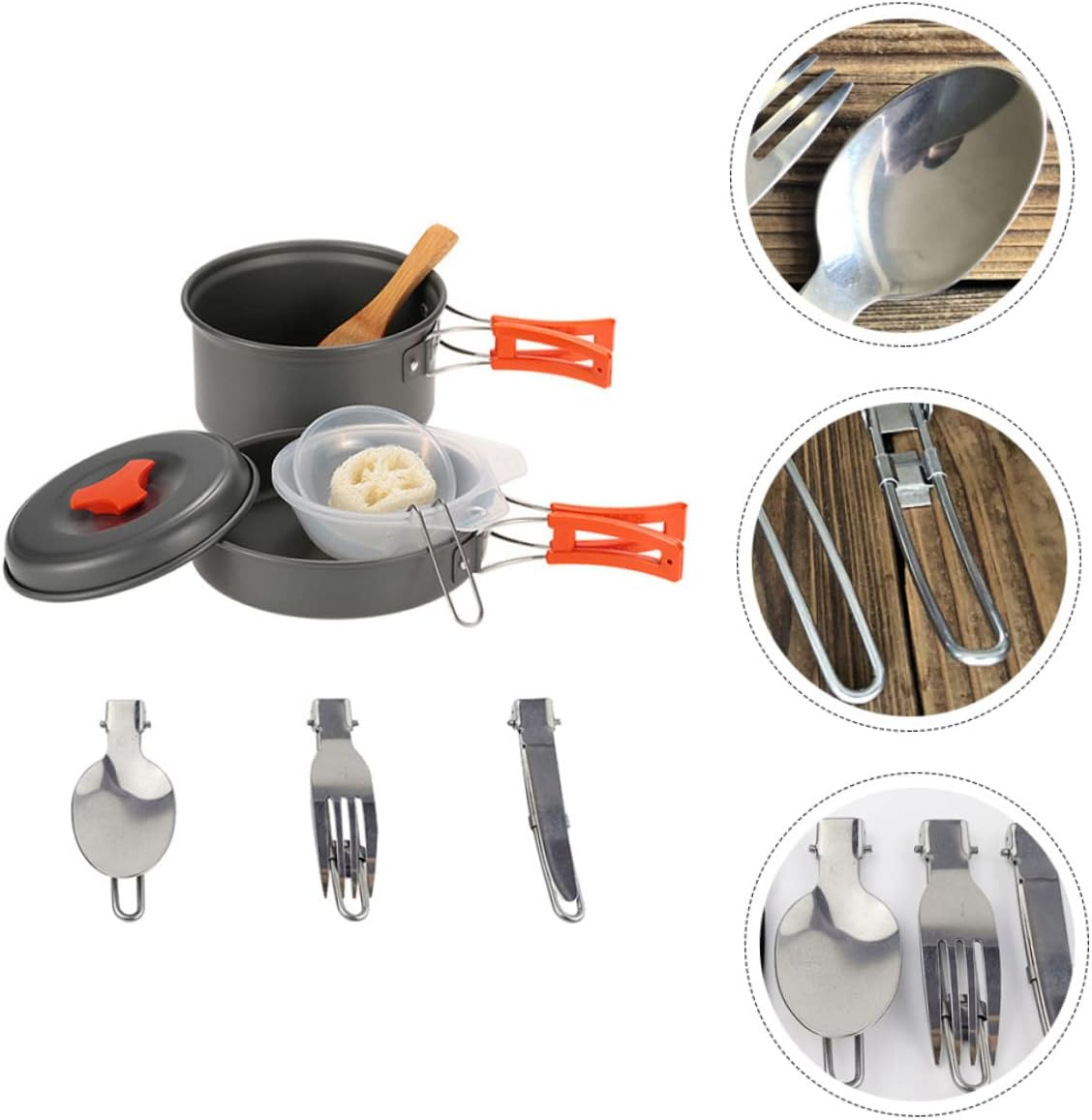Package Include 1 x Cooking Pot 1 x Fry Pan 1 x Soup Spoon 1 x Rice Scoop 1 x Loofah Cleaner 2 x Plastic Bowls 1 x Storage Bag 3 x Tablewares Features -Size(Rice Scoop): About 16.00X7.80X2.00cm/6.29X3.07X0.78in portable camping cookware -Material: Aluminum Alloy picnic tools -Size(Pot): About 14.50X14.50X8.00cm/ 5.70X5.70X3.14in cooking utensil camping kit -Size: 24.50X14.50X8.00cm/9.63X5.70X3.14in camping utensils -Color: Grey, Orange camping cooking essentials -Size(Bowl): About 11.00X4.00cm/ 4.33X1.57in camping kitchenware -Size(Frying Pan): About 15.50X3.50cm/ 6.10X1.38in(Handle: About 10cm/ 3.94in.) camping cooking gear -With all the necessary items in the kitchen, you can easily enjoy cooking outdoors camping tableware. -Suitable for both outdoor and home use, it is not only for camping but also for mountaineering, fishing and barbecue camping cooking equipment. -It's easy to clean, using these, it can give you a wonderful camping experience camping utensil. -Adopted superior and , it will serve you camping utensils metal. -The cookware forms simple and convenient save space and facilitate carrying out camp cooking utensils.Goods Descriptioncooking utensil camping kit Easy to store and use and outdoors.camping utensil Suitable for camping, backpacking, picnics and other outdoor activities.outdoor cookware This item is an outdoor tableware kit, adoption of , durable and strong.camping cookware It is a time-saving cooking toolkit