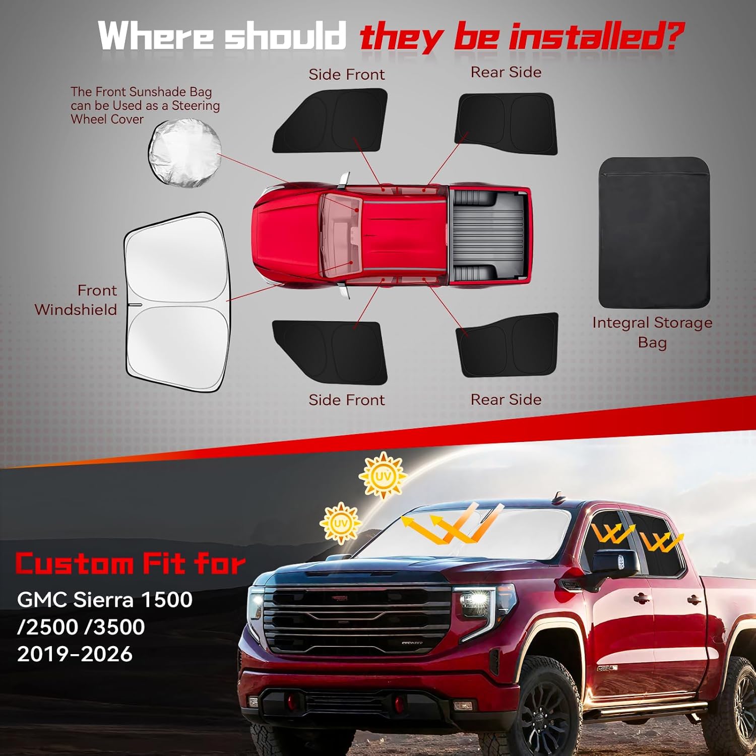 Specification: Name: Car Window Shades Material: High-quality 210T Reflective Fabric Fitment: Compatible with GMC Sierra 1500 2500 3500 (SLT, AT4, Denali) 2019 2020 2021 2022 2023 2024 2025 2026Features: 1. High-quality 210T reflective fabric 2. Custom fit 3. With dual-layer construction, provides superior heat dissipation 4. Easy to store and foldable 5. Ideal for camping, napping, and relaxing, provide a private and comfortable space 6. Protecting your car's interior has never been easier or more effectivePacking List: 1x ARISMOTOR Car Window Sun Shade Kit