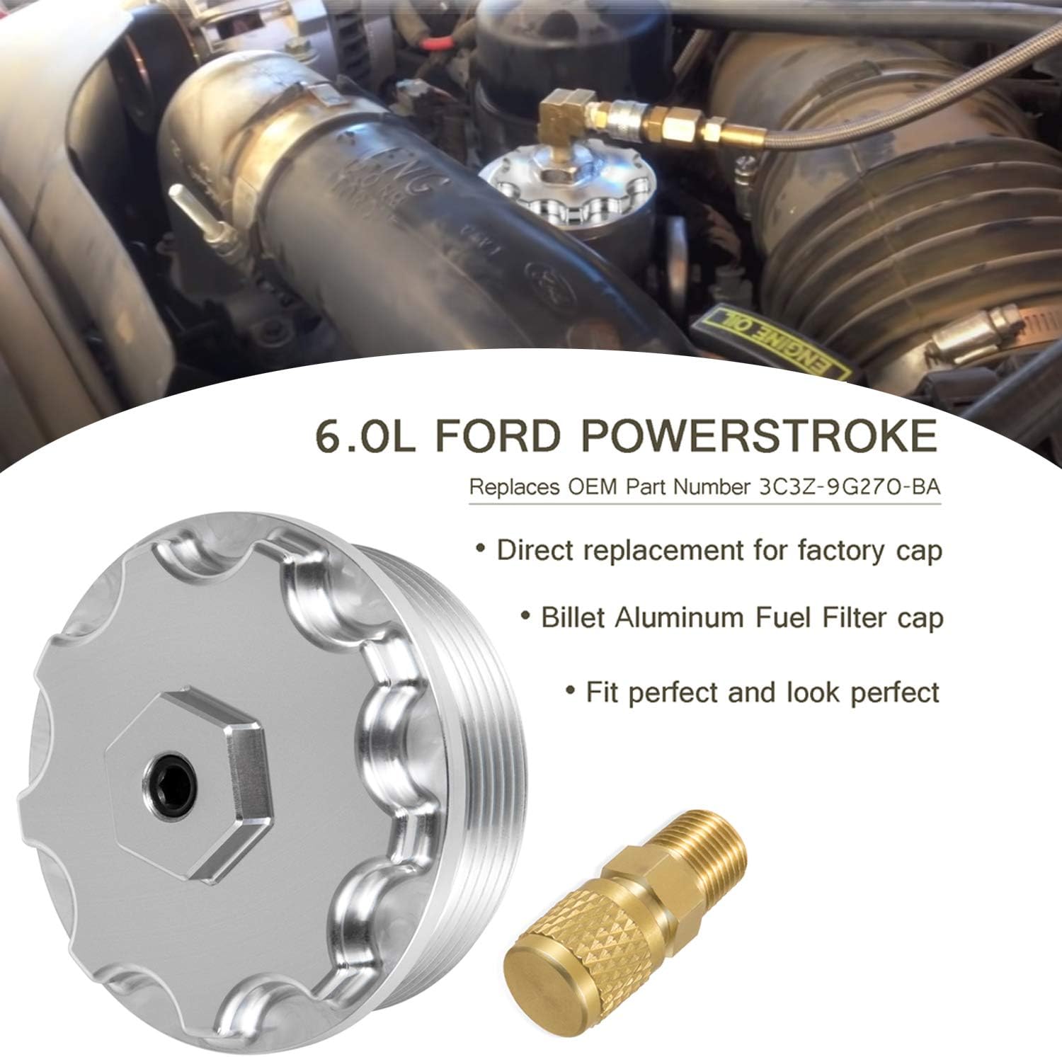 Application Information: Make: Ford Model: F-Series (F250 F350 F450 F550), E-Series Super Duty Engine: Power Stroke 6.0 Diesel Year: 2003-2007 A Must Have Kit: The fuel pressure on the Ford fit for Powerstroke 6.0L Diesel is very critical. This is one of the first things that should be checked when drivability issues are be experienced. The fuel injectors on the 6.0 are designed to run at 65 plus psi. The fuel cools the injector as well as lubricates the injector. If the engine is operated with low fuel pressure. Damage could be done to the injectors. High quality you can trust: --Both the inner and outer rubber is design for RMA-A oil resistance and permeability resistance, ensures an unparalleled long lifespan. --The fuel filter caps are made of high quality billet aluminum, resisting rust, corrosion and tear, so never worry about cracking your factory plastic 6.0L Powerstroke fuel filter caps again! Attention: Fuel Pressure Test Kit -- If the engine is operated with low fuel pressure. Damage could be done to the injectors. Fuel Filter Cap -- Must apply thread sealant to block off plugs before installation. Package Include: 1× fuel filter cap 1× oil filter cap 2× Solid brass Schrader valve test ports 1× Fuel Pressure Gauge 1× Extended Length Hose with Schrader Valve connection