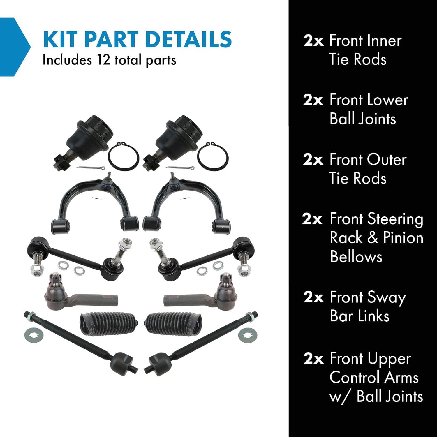 12 Piece Steering & Suspension KitKit Includes(2) Front Inner Tie Rods(2) Front Lower Ball Joints(2) Front Outer Tie Rods(2) Front Steering Rack & Pinion Bellows(2) Front Sway Bar Links(2) Front Upper Control Arms with Ball JointsFitmentToyota Tacoma 2005-11 - Base Model 4 Wheel Drive Front 2005-11 - Pre Runner Rear Wheel Drive Front 2012-13 - Pre Runner Front 2014 - Base Model 4 Wheel Drive Front 2014 - Pre Runner Rear Wheel Drive Front 2015 - Base Model 4 Wheel Drive Front with 6 Lug Wheels 2015 - Pre Runner Rear Wheel Drive Front with 6 Lug Wheels 2015 - TRD Pro 4 Wheel Drive Front with 6 Lug Wheels 2016-23 - FrontProduct AttributesQuantity: 12 PieceProduct Features Application Specific Design: No modifications necessary Anti-Corrosion Coated: Enhanced surface life Pre-greased: No additional maintenance required Kitted for Restored Performance: Improved road-feel and handlingItem DetailsTRQ suspension kits are manufactured using premium raw materials and coatings for extended service life. Each TRQ suspension component is designed to be a direct, maintenance-free replacement to the stock unit. To extend the life of your steering and suspension components, TRQ recommends replacing components in pairs, sets, or kits. All products are fit and road-tested in our Massachusetts R&D facility to ensure we deliver on our promise of Trusted Reliable Quality.Reference Numbers101-5484101-5517101-6394101-6395101-8436102-6452102-6454103-307015250581525059260670426067053CB864323CB864334504609340450466924545503094904550309520455030955048068040304806804040480680406048069040304806904040480690406048610-04020486100402048630-04020486300402048810040104882004020511-58249R511-58251L522-721522-722539-922542-493542-494543-682544-46688-1580-K88-1626-K8CB863168CB86325CA528BCA529BCB74067CB74067PRCB74068CB74068PRCB86056CB86057CMS861040CMS861041CMS861044CMS861045CMS861196CMS861197ES80895EV800529K80827K80946K80948MES80895MS861044MS861045MS86114MS86115MS86527MS86707MS86849MS86850RK621474RK621475RK621769RK621770SUS00354SUS05258SUS05259SUS06891SUS06892SUS07211SUS07920SUS07921TA5034TC5466TC5556X50BJ7752X50TE4210X50TR0030