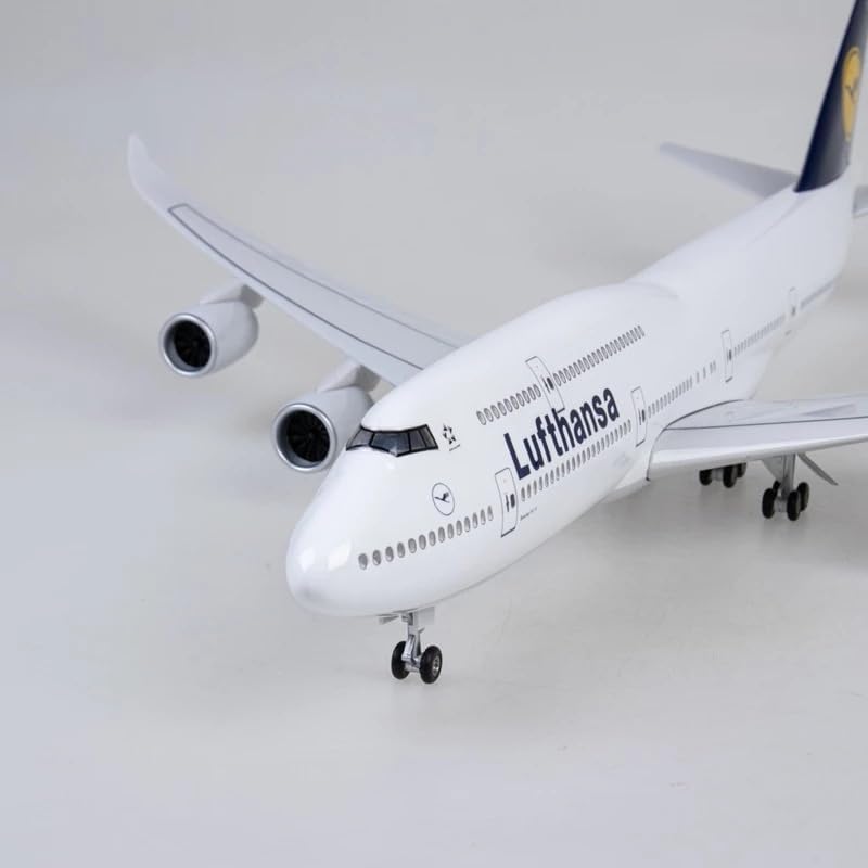 1:150 Scale 47cm B747 Airplane Model Lufthansa 747 Aircraft Model with Lights and Landing Gear Die-cast Resin Model Airplane Kit NOTE:1 This model with base and wheels! and in order to send to you not over size, we take the wing and wheels off, you could assembly it yourself. 1X Aircraft Model Importance :The item was made of Alloy and resin,it may have a little paint stripping,if you mind,kindly do not purchase here. Importance :Pls do not blow and damage. Notice:Computer monitors display colors quite differently,the color of the article may vary slightly from the pictures above The Airplane Models of LED Voice Control "User Manual Operating introduction: 1. Turn the fuselage belly power switch to ON. 2. Clap hands or tap the fuselage lightly to the models, thelamp will be light and set as extinguished automatically after20 seconds. 3. The models has built-in 75mAh lithium battery, when thebattery use up, please use android charger to charging themodel (The model is not equipped with charger). The redindicating light will be light up when it charging, extinguishedautomatically after being full of charge. The charging timeneeds about 1 hour. Safety Attentions: 1. Model can not keep charged state for a long time, pleasepull out the charger plug when the model is full of electricity.2. Turn off the power switch when the model is transportationor not used. 3. This product belong to the static simulation models, thecorner is sharpness, some parts are fragility, Please pay attention to safety.