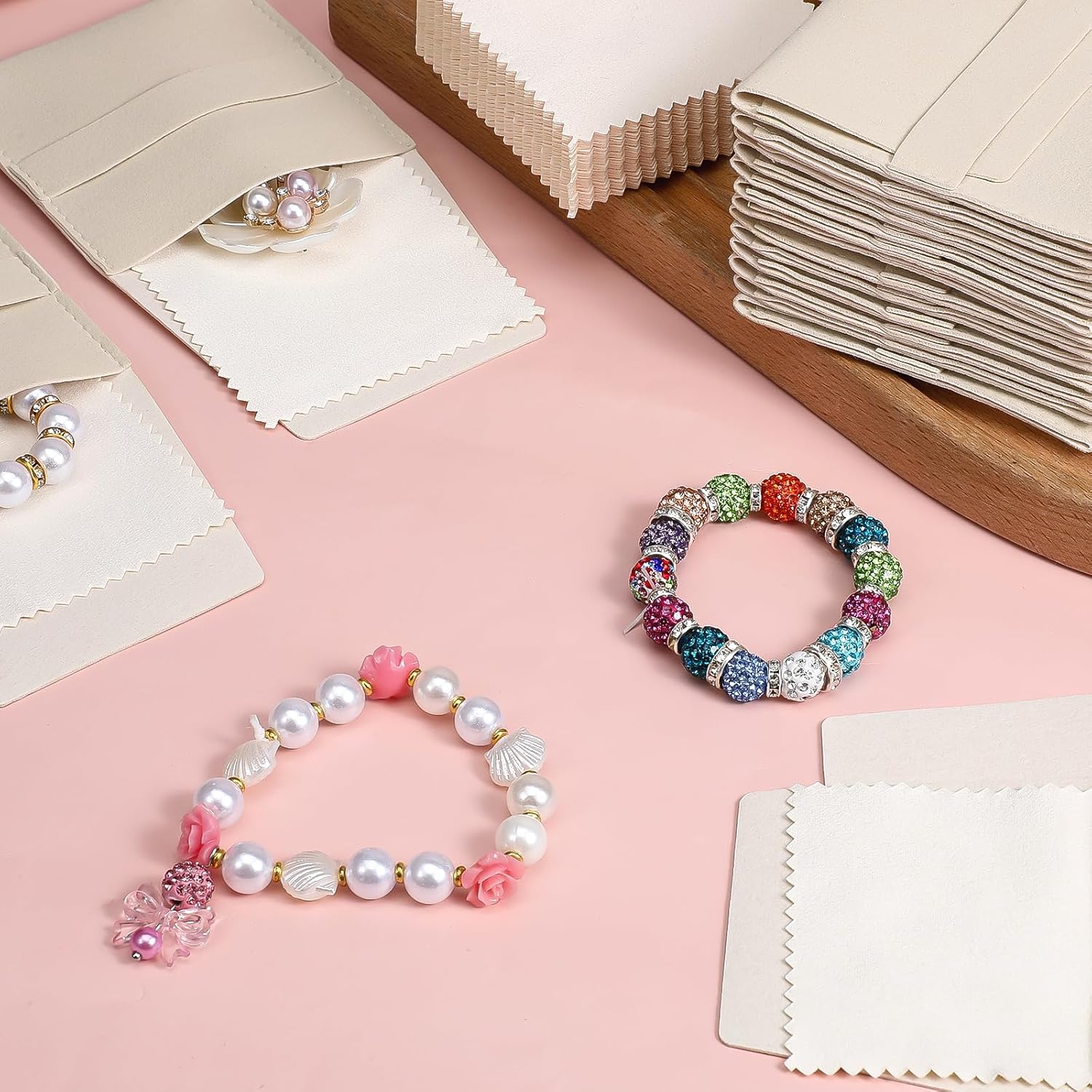 Package Includes: 120-piece beige microfiber jewelry pouch + 120-piece cleaning clothProduct Name: Microfiber Jewelry Pouch + Cleaning ClothMaterial: Microfiber Cloth + PolyesterColor: BeigeWeight (g): 773Dimensions (cm): Jewelry Pouch 8.5*8cm/3.35*3.15inches, Cleaning Cloth 7*7cm/2.76*2.76inches