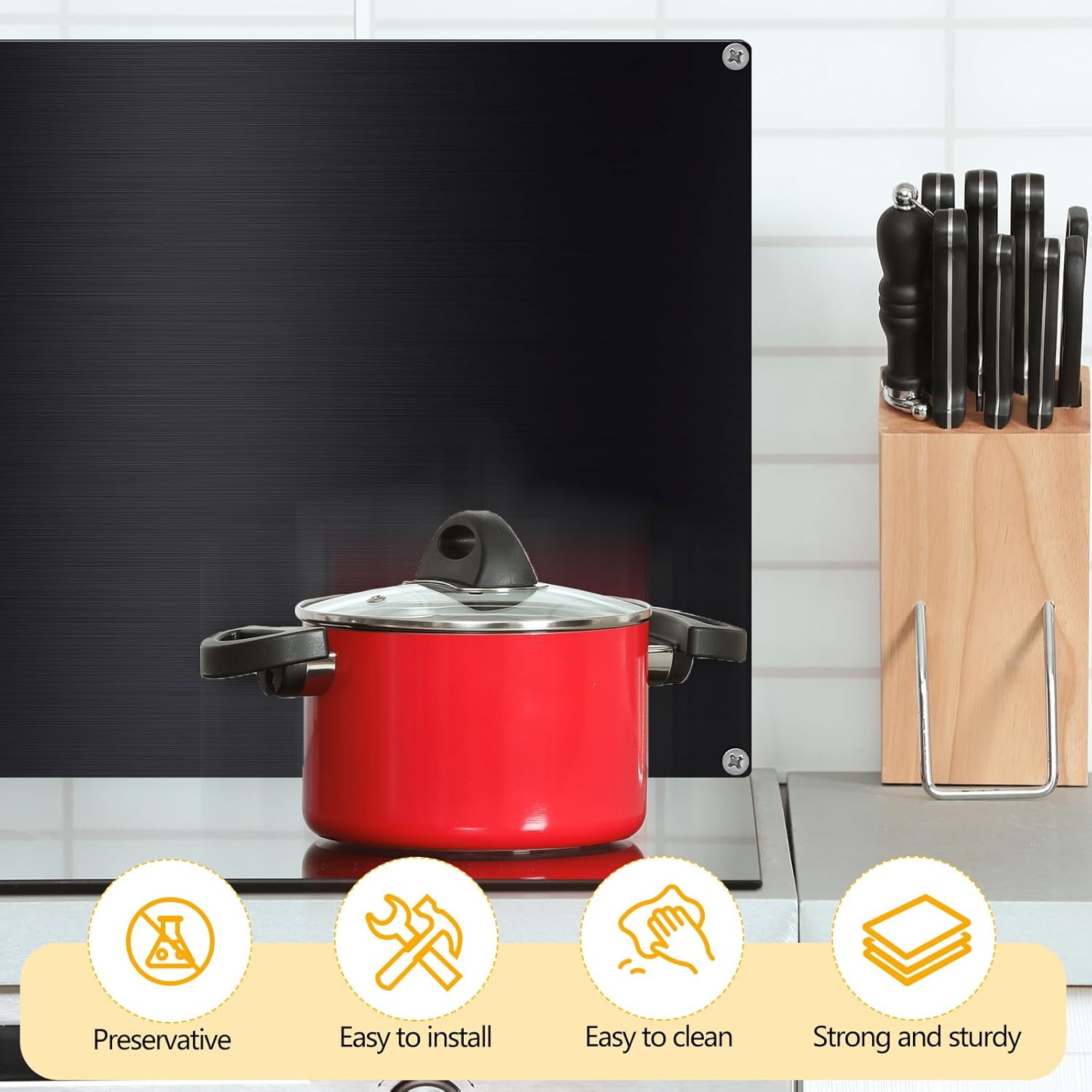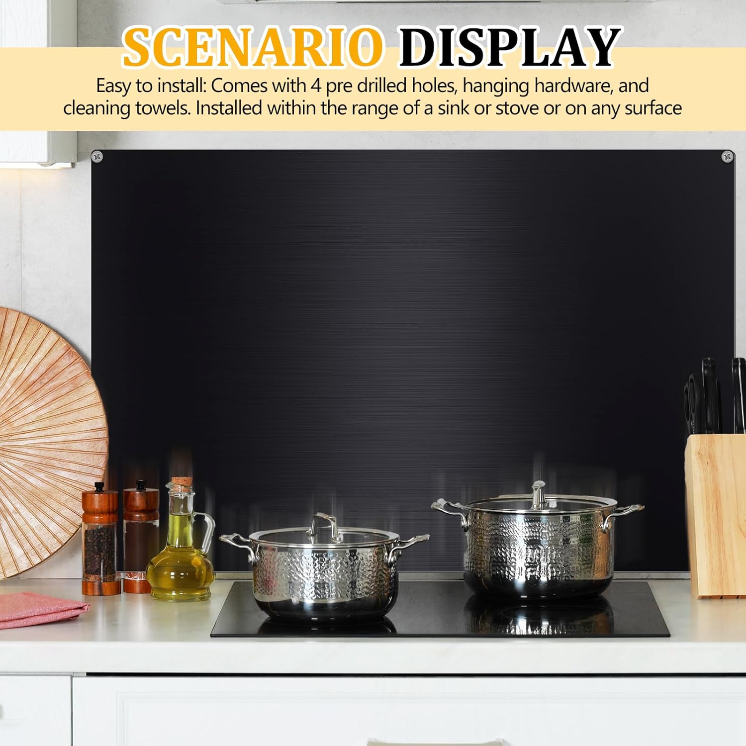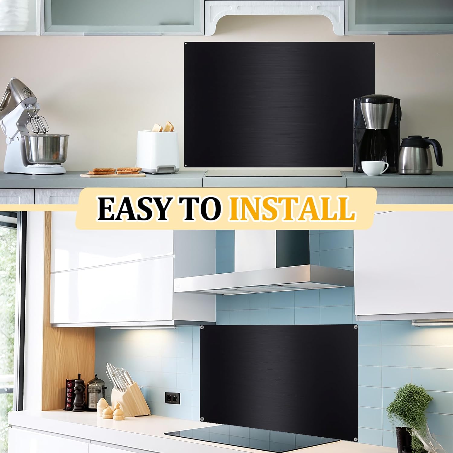 Features: The surface of our backsplash panel is coated with a film that avoids scratches, ensuring it maintains its smooth appearance, please peel the film off before installation. This kitchen stove backsplash is feasible to be a housewarming gift to your friends, family, relatives and neighbors, making them feel your sincere thoughtfulness. Specifications: Backsplash material: 304 stainless steel Color: Backsplash and screws: black Towel: coffee Size: Blacksplash: approx. 30 x 36 inches Towel: approx. 11.81 x 11.81 inches/ 30 x 30 cm Package includes: 1 x Stainless steel backsplash for stove 4 x Screws 1 x Hanging towel Warm notes: Poking and swallowing risks may exist, please keep them away from little kids. Please note the size detail information before ordering. Manual measurement, please allow slight errors on size. The color may exist a slight difference due to different screen displays.
