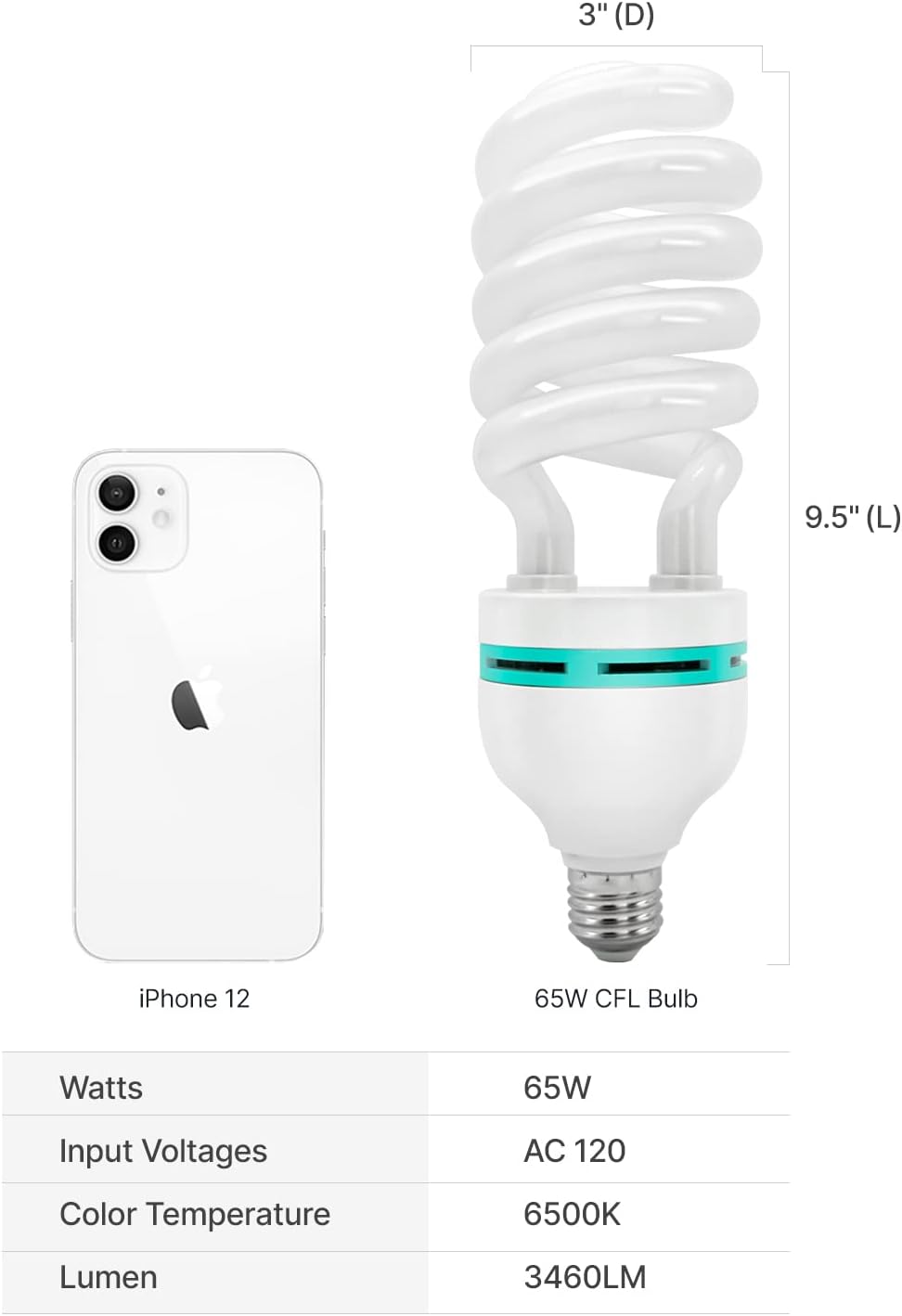 (1) x Photography Studio 65 Watt Compact Fluorescent Light Bulb Daylight Energy Saving Compact Fluorescent Spiral Bulb - Saves energy up to 80% Regular Screw Base Color Temperature: 6500K Watts: 65W - Equals to 300W Regular Incandescent Light Bulb Output Style: Spiral Lamp Tone: Day Light Overall Diameter: 3" Overall Length: 10"Photo Light BulbPhoto Studio Daylight BulbPhotography CFL Bulb
