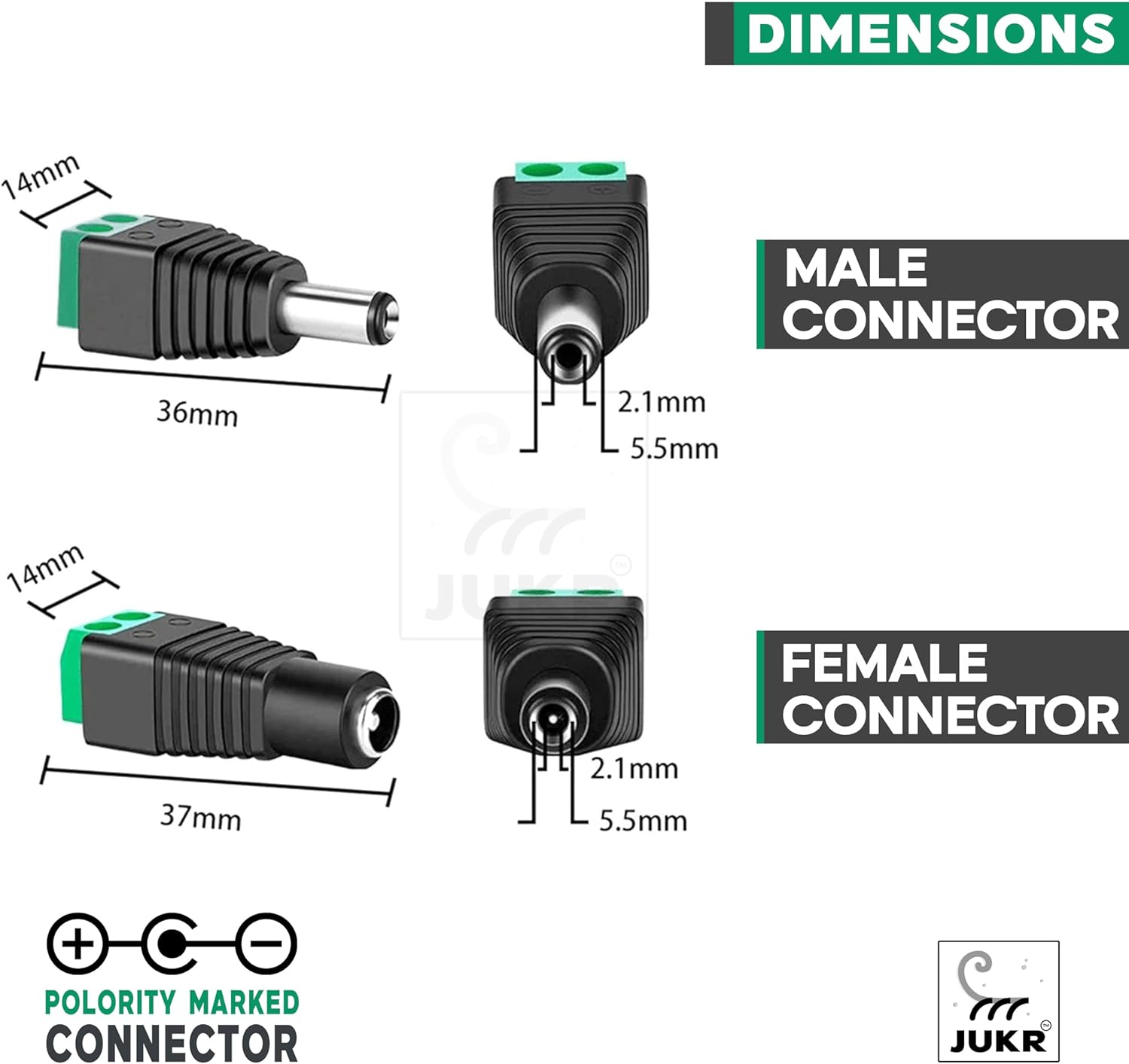 Product description The JUKR Multipurpose Male & Female DC Power Supply Jack Plug Barrel Connector set is compatible with DC 24 Volts, 12 Volts, 9 Volts and 5 Volts sources of power with 5A rated current. It is designed for both male and female configurations, and features a sleek black and green theme that fits well with any arrangement and provides a polished and modern look. At just 20 grams in weight and 2.1 mm x 5.5 mm in size, each connector is compact and light, making handling and installation easy. The JUKR connectors are constructed of quality zinc alloy and nickel plated and they're offering their continued durability. Effective conductivity for reliable transmission of power is supplied by these highest quality components, in addition to improving connections resistance to wear and strain. The positive and negative terminals of the JUKR DC Power Plug Connector can be readily identified because of the clear marks on the connector terminals. This feature provides quick and error free installations, making it especially useful for do it yourselfers, service center professionals, and college students working on DIY projects. Whether you're installing CCTV camera security system for home or office, car dashboard rear view camera monitoring systems, connecting LED light strips, or placing security cameras for safety of your house and place of a company.Featuring the optimum voltage connection and insulation to prevent any power-related issues, the robust creation offers a reliable and secure connection. Available in a pack of 5 male and 5 female DC adapter barrel connectors, has enough components to meet each of your various electrical needs. You are able to achieve secure connections with the JUKR Multipurpose DC Power Plug Connector set, ensuring that your electrical devices operate properly and efficiently. Embrace the ease of use and amazing performance of JUKR DC Power Plug connectors for all of your power supply needs. Manufacturer Contact Information 94896 32323
